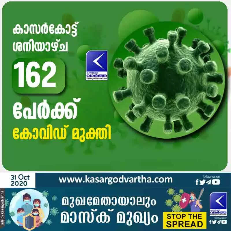 കാസര്കോട് ശനിയാഴ്ച 162 പേർക്ക് കോവിഡ് മുക്തി