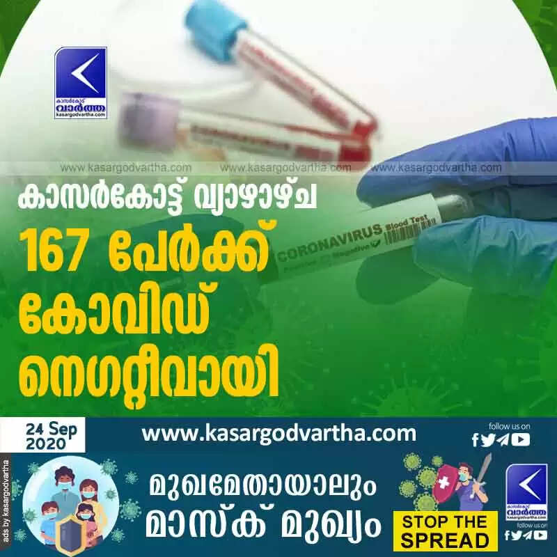 കാസർകോട്ട് വ്യാഴാഴ്ച 167 പേര്ക്ക് കോവിഡ് നെഗറ്റീവായി