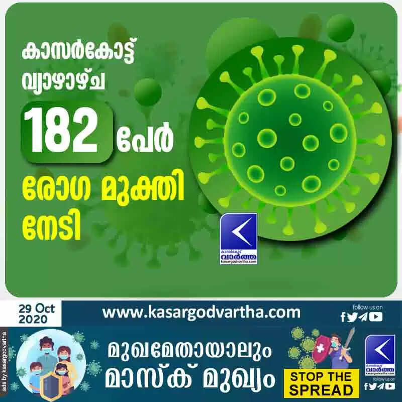 കാസർകോട് വ്യാഴാഴ്ച 182 പേർ രോഗമുക്തി നേടി