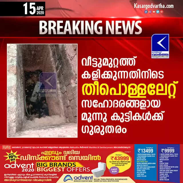ചെര്‍ക്കള: (www.kasargodvartha.com 15.04.2020) വീട്ടുമുറ്റത്ത് കളിക്കുന്നതിനിടെ തീപൊള്ളലേറ്റ് സഹോദരങ്ങളായ മൂന്നു കുട്ടികള്‍ക്ക് ഗുരുതരമായി പരിക്കേറ്റു. ആദൂര്‍ സ്വദേശിയും നെല്ലിക്കട്ട ജുമാ മസ്ജിദിന് സമീപം താമസക്കാരനുമായ എ ടി താജുദ്ദീന്‍ നിസാമി - ത്വയിബ ദമ്പതികളുടെ മക്കളായ ഫാത്വിമ (11) അബ്ദുല്ല (ഒമ്പത്) മുഹമ്മദ് ആഷിഖ് (ഏഴ്) എന്നിവര്‍ക്കാണ് ഗുരുതരമായി പൊള്ളലേറ്റത്.