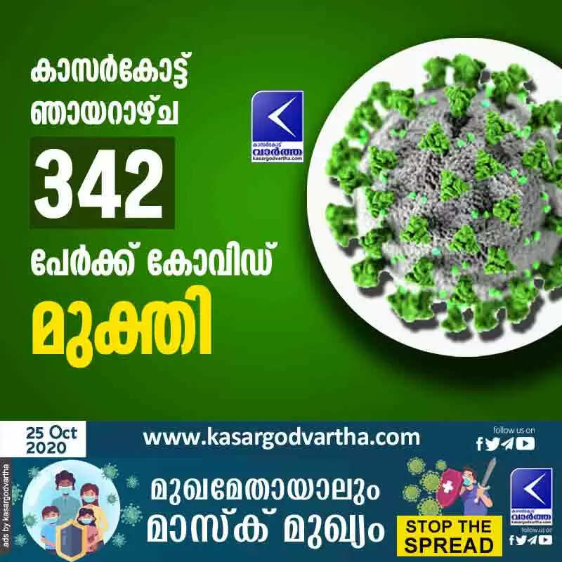 കാസർകോട്ട് ഞായറാഴ്ച 342 പേര്‍ക്ക് കോവിഡ് മുക്തി