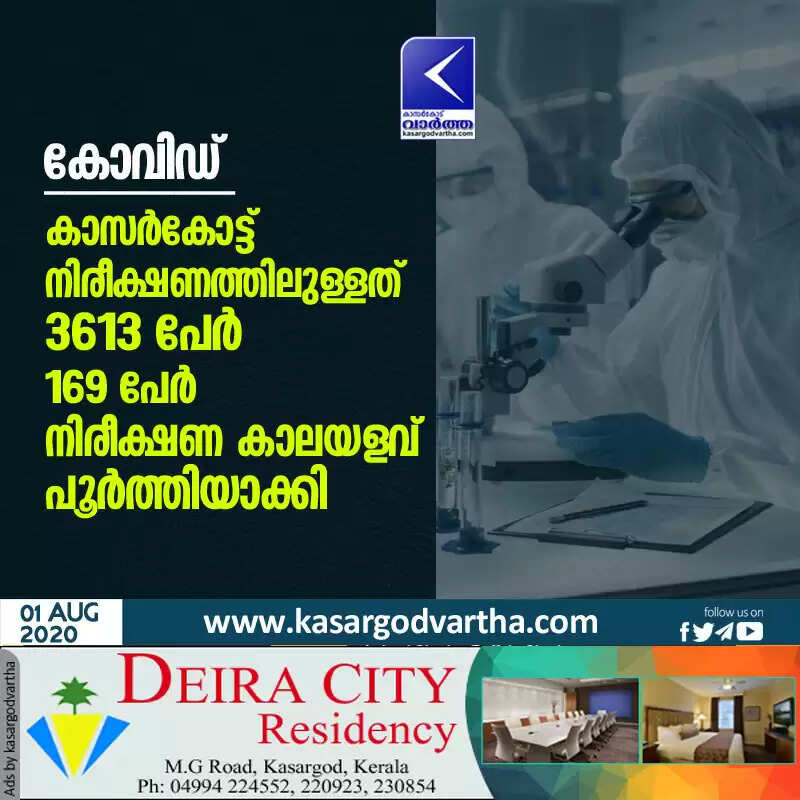 കോവിഡ്: കാസർകോട്ട് നിരീക്ഷണത്തിലുള്ളത് 3613 പേര്; 169 പേര് നിരീക്ഷണ കാലയളവ് പൂര്ത്തിയാക്കി