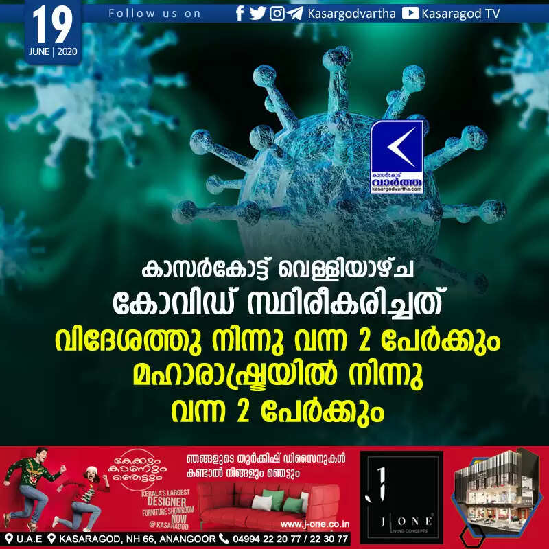 കാസര്കോട്ട് വെള്ളിയാഴ്ച കോവിഡ് സ്ഥിരീകരിച്ചത് വിദേശത്തു നിന്നു വന്ന 2 പേര്ക്കും മഹാരാഷ്ട്രയില് നിന്നു വന്ന 2 പേര്ക്കും