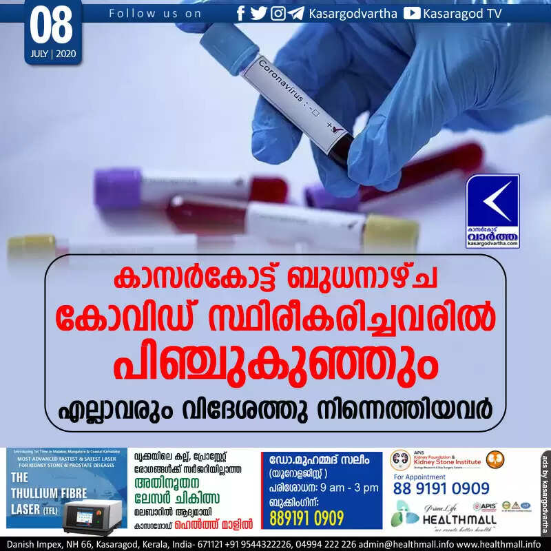 കാസര്കോട്ട് ബുധനാഴ്ച കോവിഡ് സ്ഥിരീകരിച്ചവരില് പിഞ്ചുകുഞ്ഞും; എല്ലാവരും വിദേശത്തു നിന്നെത്തിയവര്
