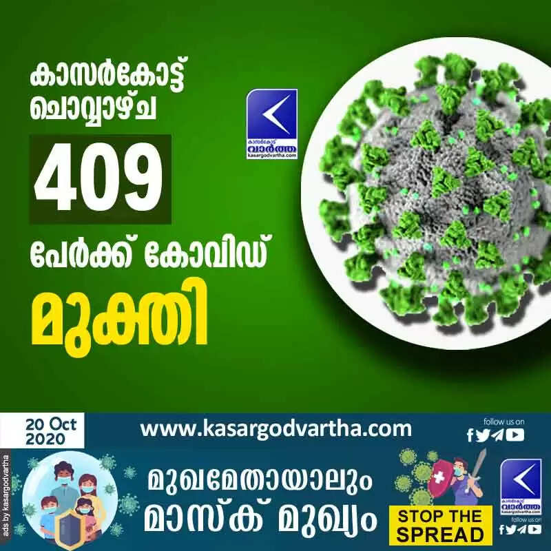 കാസർകോട്ട് ചൊവ്വാഴ്ച 409 പേര്ക്ക് കോവിഡ് മുക്തി