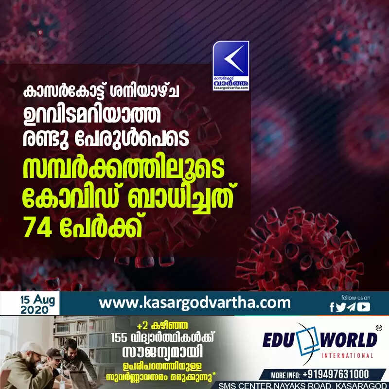 കാസര്‍കോട്ട് ശനിയാഴ്ച ഉറവിടമറിയാത്ത രണ്ടു പേരുള്‍പെടെ സമ്പര്‍ക്കത്തിലൂടെ കോവിഡ് ബാധിച്ചത് 74 പേര്‍ക്ക്