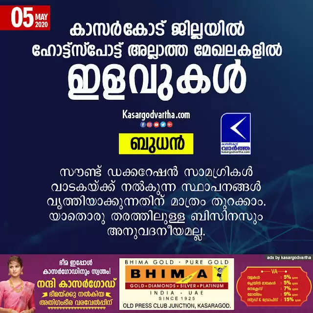കാസര്കോട് ജില്ലയില് ഹോട്സ്പോട്ട് അല്ലാത്ത മേഖലകളില് ബുധനാഴ്ച സൗണ്ട് ഡക്കറേഷന് സാമഗ്രികള് വാടകയ്ക്ക് നല്കുന്ന സ്ഥാപനങ്ങള് തുറന്ന് വൃത്തിയാക്കാന് അനുമതി