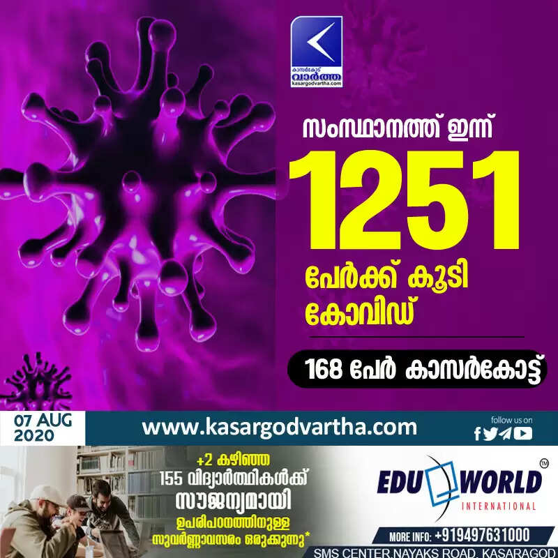 സംസ്ഥാനത്ത് വെള്ളിയാഴ്ച 1251 പേര്ക്ക് കൂടി കോവിഡ്; കാസര്കോട്ട് 168 പേര്