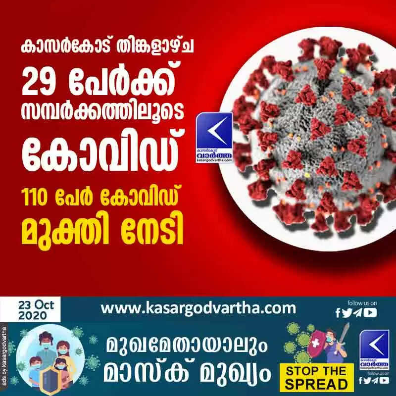 കാസർകോട് തിങ്കളാഴ്ച 29 പേർക്ക് സമ്പർക്കത്തിലൂടെ കോവിഡ്; 110 പേർ കോവിഡ് മുക്തി നേടി