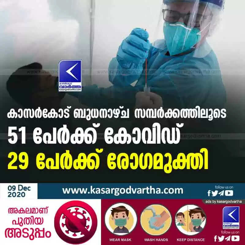 കാസര്കോട് ബുധനാഴ്ച സമ്പര്ക്കത്തിലൂടെ 51 പേര്ക്ക് കോവിഡ്; 29 പേര്ക്ക് രോഗമുക്തി
