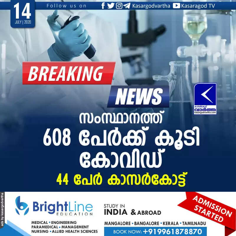 സംസ്ഥാനത്ത് 608 പേര്ക്ക് കൂടി കോവിഡ്; 44 പേര് കാസര്കോട്ട്