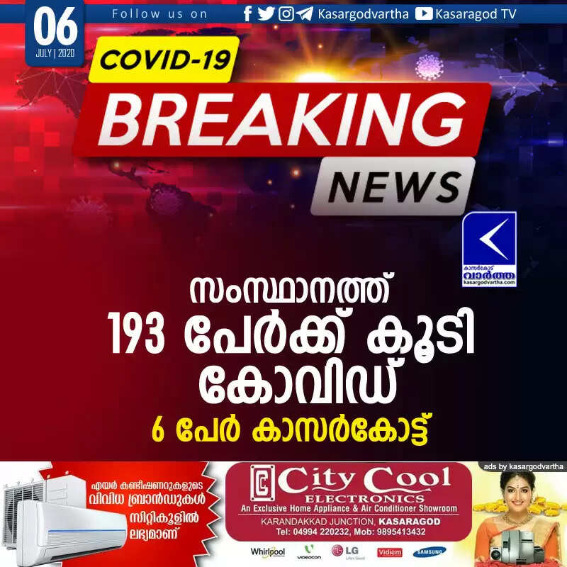 സംസ്ഥാനത്ത് 193 പേര്ക്ക് കൂടി കോവിഡ്; 6 പേര് കാസര്കോട്ട്