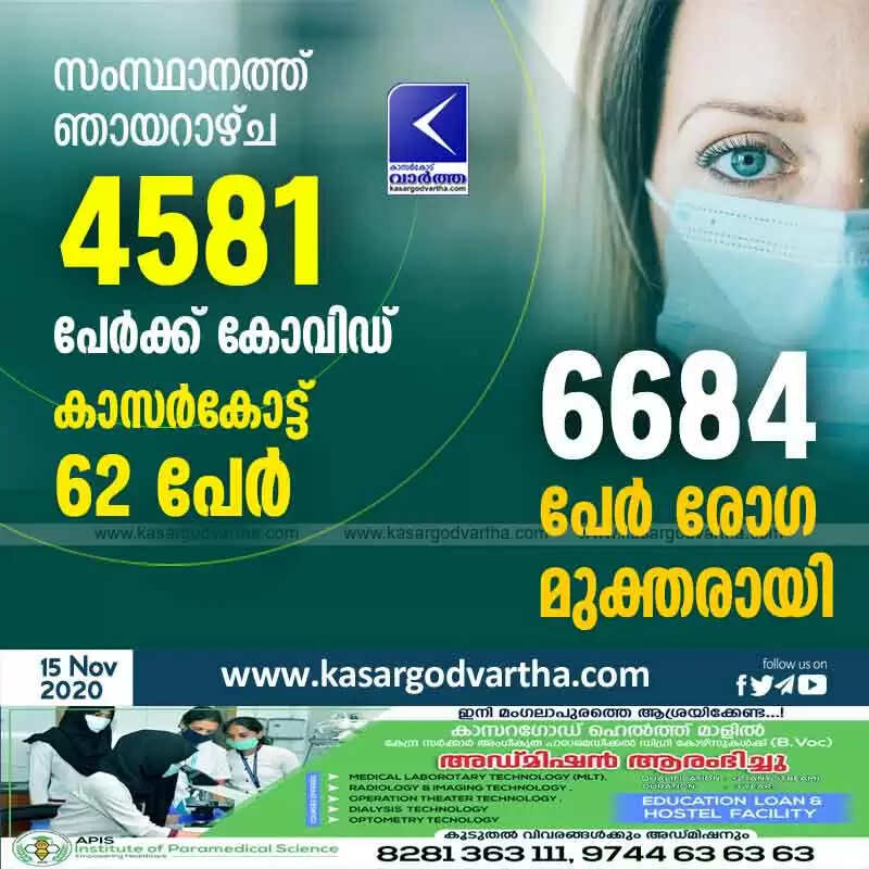 കാസര്കോട്: (www.kasargodvartha.com 15.11.2020) സംസ്ഥാനത്ത് ഞായറാഴ്ച 4581 പേര്ക്ക് കോവിഡ് സ്ഥിരീകരിച്ചു.