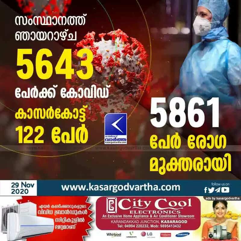 സംസ്ഥാനത്ത് ഞായറാഴ്ച 5643 പേര്ക്ക് കോവിഡ്; കാസര്കോട് 122 പേര്