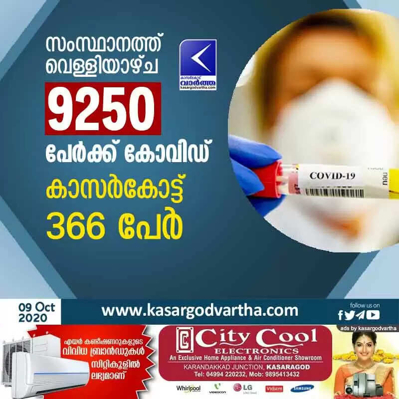 സംസ്ഥാനത്ത് വെള്ളിയാഴ്ച 9250 പേര്ക്ക് കോവിഡ്; കാസര്കോട്ട് 366 പേര്
