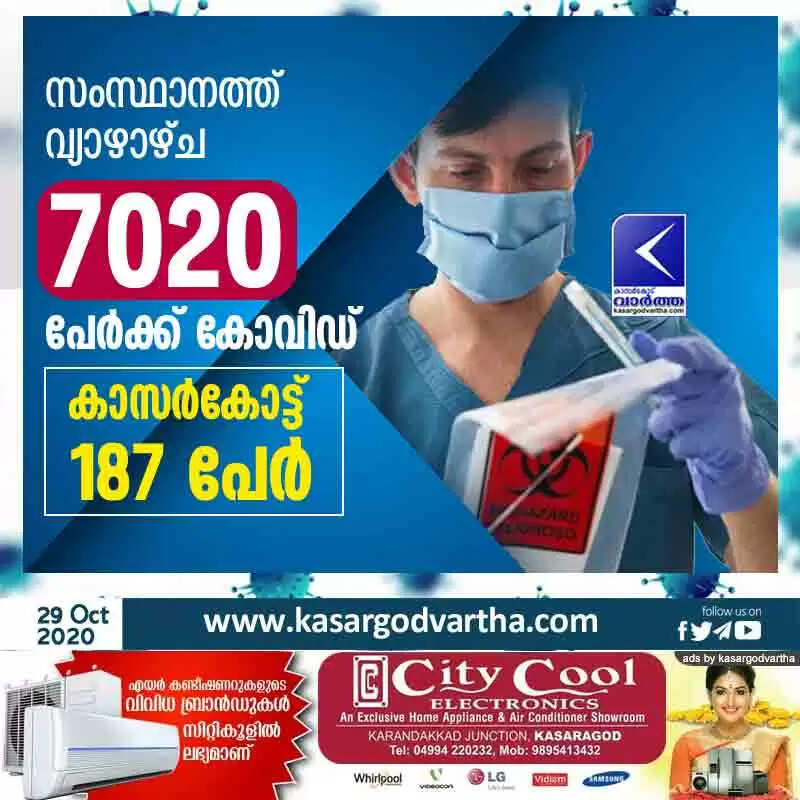 സംസ്ഥാനത്ത് വ്യാഴാഴ്ച 7020 പേര്ക്ക് കോവിഡ്; കാസര്കോട്ട് 187 പേര്