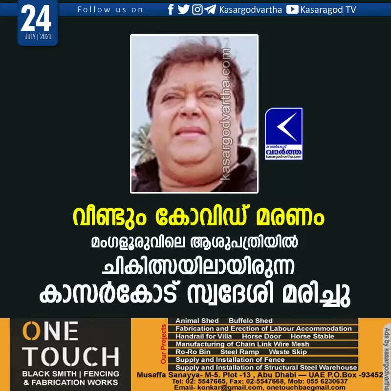 വീണ്ടും കോവിഡ് മരണം; മംഗളൂരുവിലെ ആശുപത്രിയില്‍ ചികിത്സയിലായിരുന്ന കാസര്‍കോട് സ്വദേശി മരിച്ചു