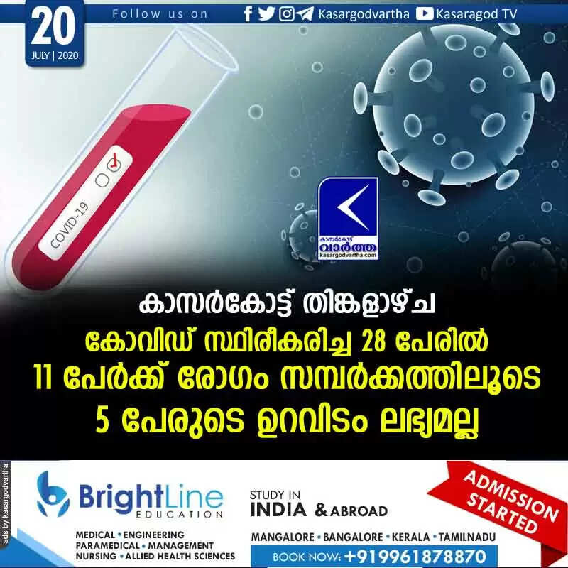 കാസര്കോട്ട് തിങ്കളാഴ്ച കോവിഡ് സ്ഥിരീകരിച്ച 28 പേരില് 11 പേര്ക്ക് രോഗം സമ്പര്ക്കത്തിലൂടെ; 5 പേരുടെ ഉറവിടം ലഭ്യമല്ല