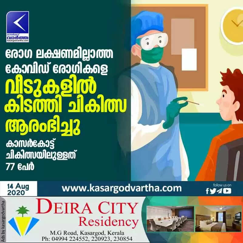 രോഗ ലക്ഷണമില്ലാത്ത കോവിഡ് രോഗികളെ വീടുകളില് കിടത്തി ചികിത്സ ആരംഭിച്ചു; കാസര്കോട്ട് ചികിത്സയിലുള്ളത് 77 പേര്