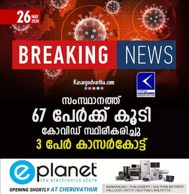 സംസ്ഥാനത്ത് 67 പേര്ക്ക് കൂടി കോവിഡ് സ്ഥിരീകരിച്ചു; 3 പേര് കാസര്കോട്ട്