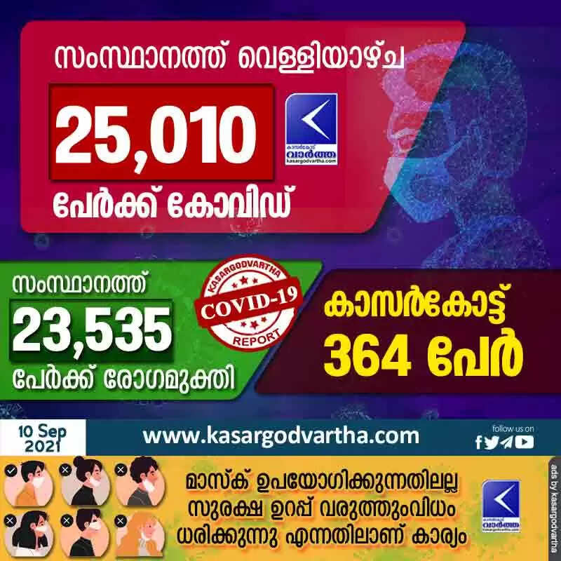സംസ്ഥാനത്ത് വെള്ളിയാഴ്ച 25,010 പേര്ക്ക് കോവിഡ്-19 സ്ഥിരീകരിച്ചു കാസര്കോട് 364 പേര്.