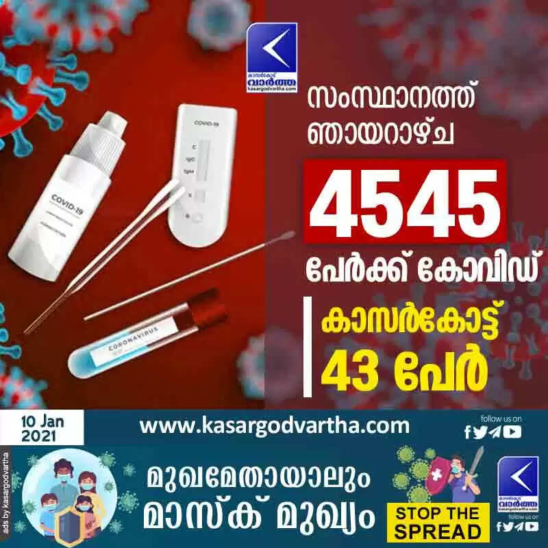 സംസ്ഥാനത്ത് ഞായറാഴ്ച 4545 പേര്‍ക്ക് കോവിഡ്; കാസര്‍കോട് 43 പേര്‍
