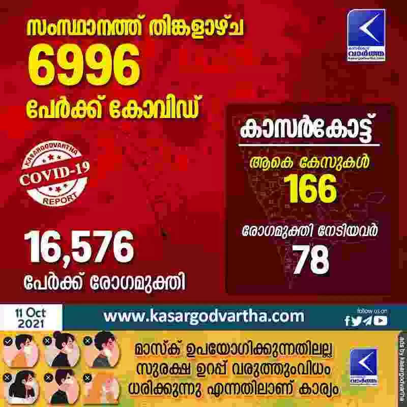 സംസ്ഥാനത്ത് തിങ്കളാഴ്ച 6996 പേര്ക്ക് കോവിഡ്-19 സ്ഥിരീകരിച്ചു; കാസര്കോട് 166 പേര്