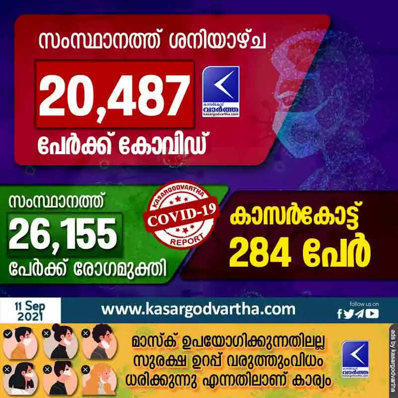 സംസ്ഥാനത്ത് ശനിയാഴ്ച 20,487 പേര്ക്ക് കോവിഡ്-19 സ്ഥിരീകരിച്ചു കാസര്കോട് 284 പേര്