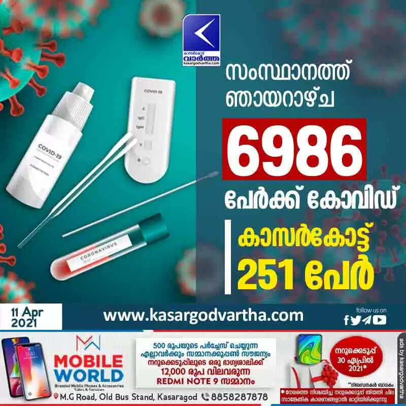 സംസ്ഥാനത്ത് ഞായറാഴ്ച 6986 പേര്ക്ക് കോവിഡ്; കാസര്കോട് 251 പേര്