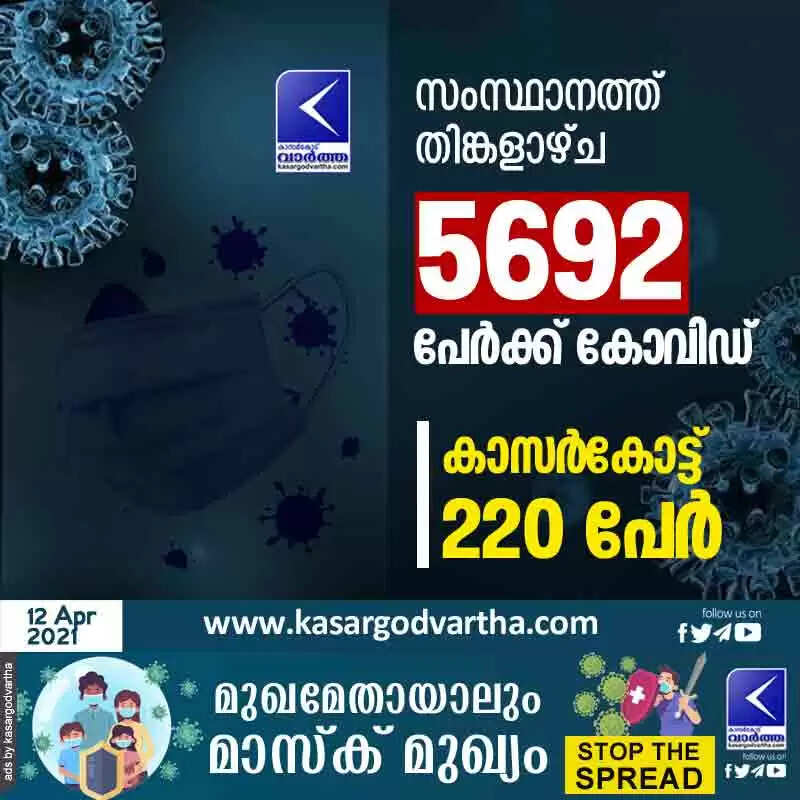 സംസ്ഥാനത്ത് തിങ്കളാഴ്ച 5692 പേര്ക്ക് കോവിഡ്; കാസര്കോട് 220 പേര്