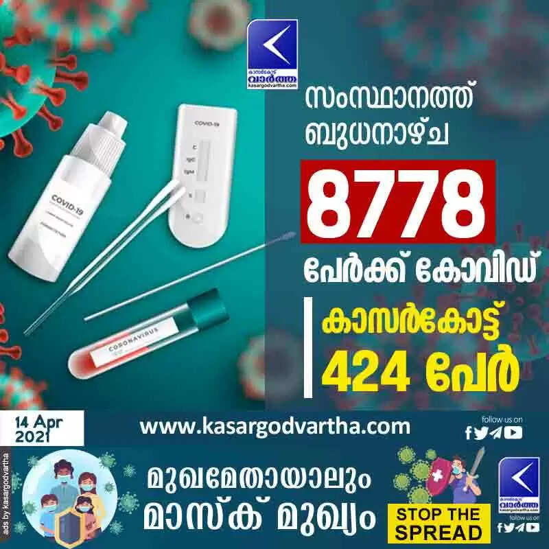സംസ്ഥാനത്ത് ബുധനാഴ്ച 8778 പേര്ക്ക് കോവിഡ്; കാസര്കോട് 424 പേര്