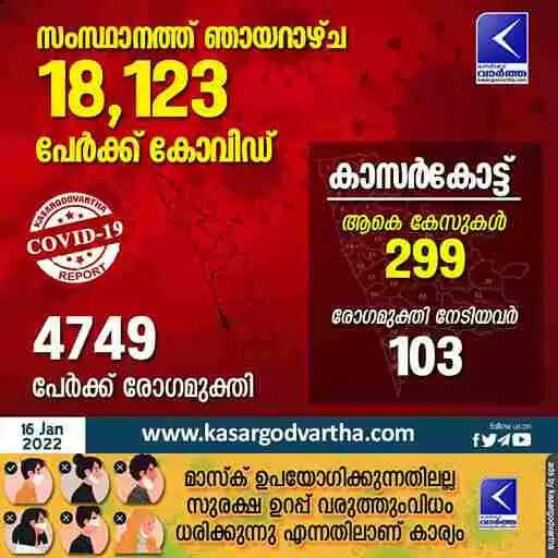 സംസ്ഥാനത്ത് ഞായറാഴ്ച 18,123 പേര്‍ക്ക് കോവിഡ്: കാസർകോട് 103 പേര്‍