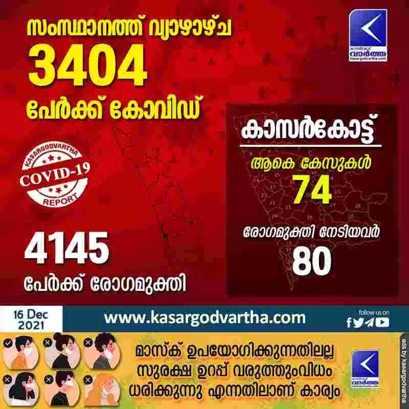 സംസ്ഥാനത്ത് വ്യാഴാഴ്ച 3404 പേര്ക്ക് കോവിഡ്: കാസർകോട് 74 പേര്