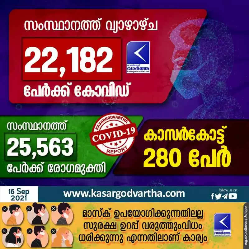 സംസ്ഥാനത്ത് വ്യാഴാഴ്ച 22,182  പേര്‍ക്ക് കോവിഡ്-19 സ്ഥിരീകരിച്ചു: കാസർകോട് 280  പേർ