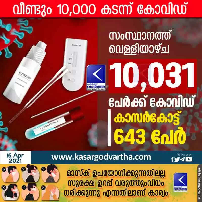 സംസ്ഥാനത്ത് വെള്ളിയാഴ്ച 10,031 പേര്ക്ക് കോവിഡ്; കാസര്കോട് 643 പേര്