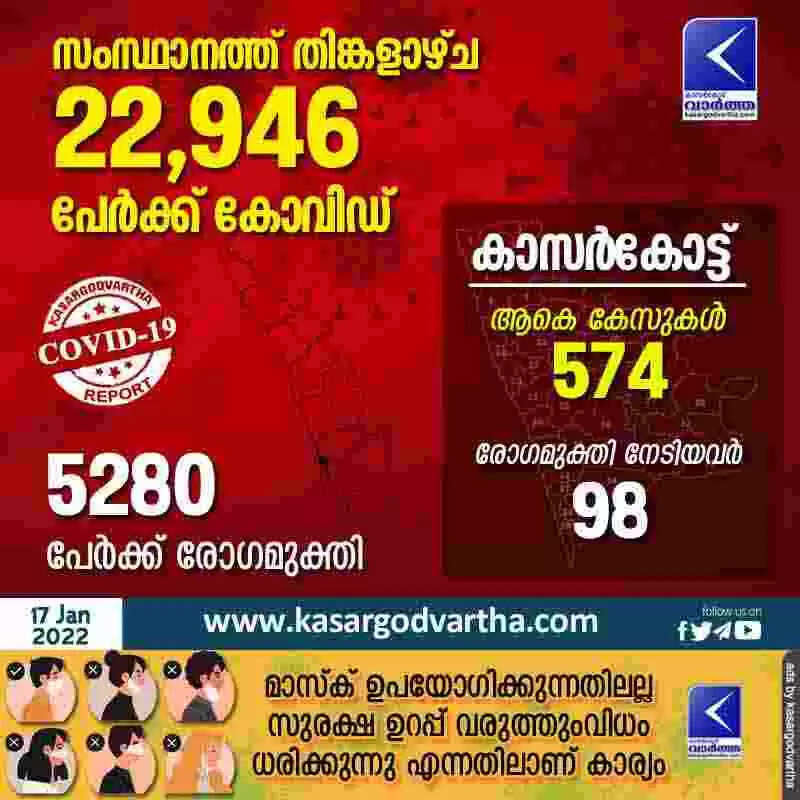 സംസ്ഥാനത്ത് തിങ്കളാഴ്ച 22,946 പേര്‍ക്ക് കോവിഡ്: കാസർകോട് 574 പേര്‍