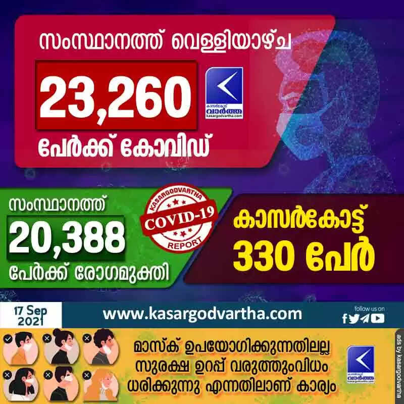 സംസ്ഥാനത്ത് വെള്ളിയാഴ്ച 23,260 പേര്ക്ക് കോവിഡ്-19 സ്ഥിരീകരിച്ചു കാസര്കോട് 330 പേര്