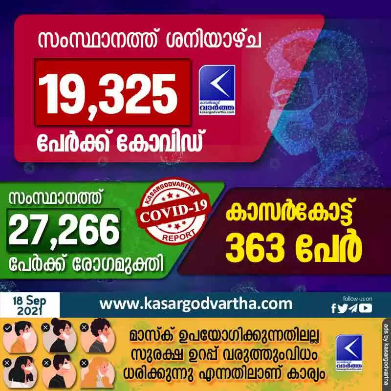 സംസ്ഥാനത്ത് ശനിയാഴ്ച 19,325 പേര്‍ക്ക് കോവിഡ്-19 സ്ഥിരീകരിച്ചു കാസര്‍കോട്‌ 363 പേര്‍