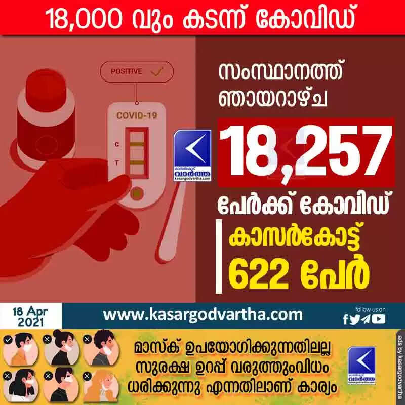 സംസ്ഥാനത്ത് ഞായറാഴ്ച 18,257 പേര്ക്ക് കോവിഡ്; കാസര്കോട് 622 പേര്