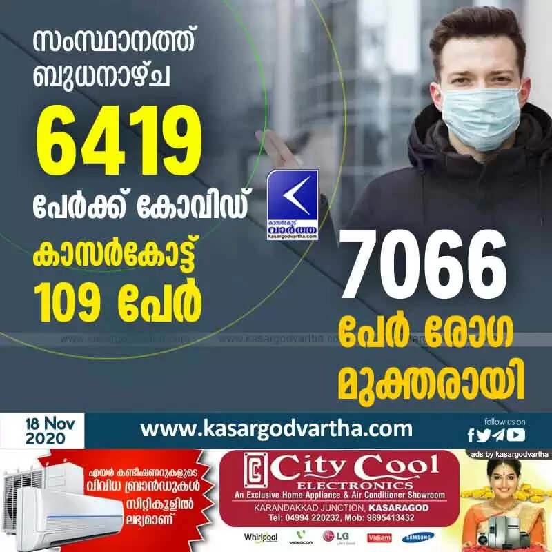സംസ്ഥാനത്ത് ബുധനാഴ്ച 6419 പേര്ക്ക് കോവിഡ്; കാസര്കോട് 109 പേര്