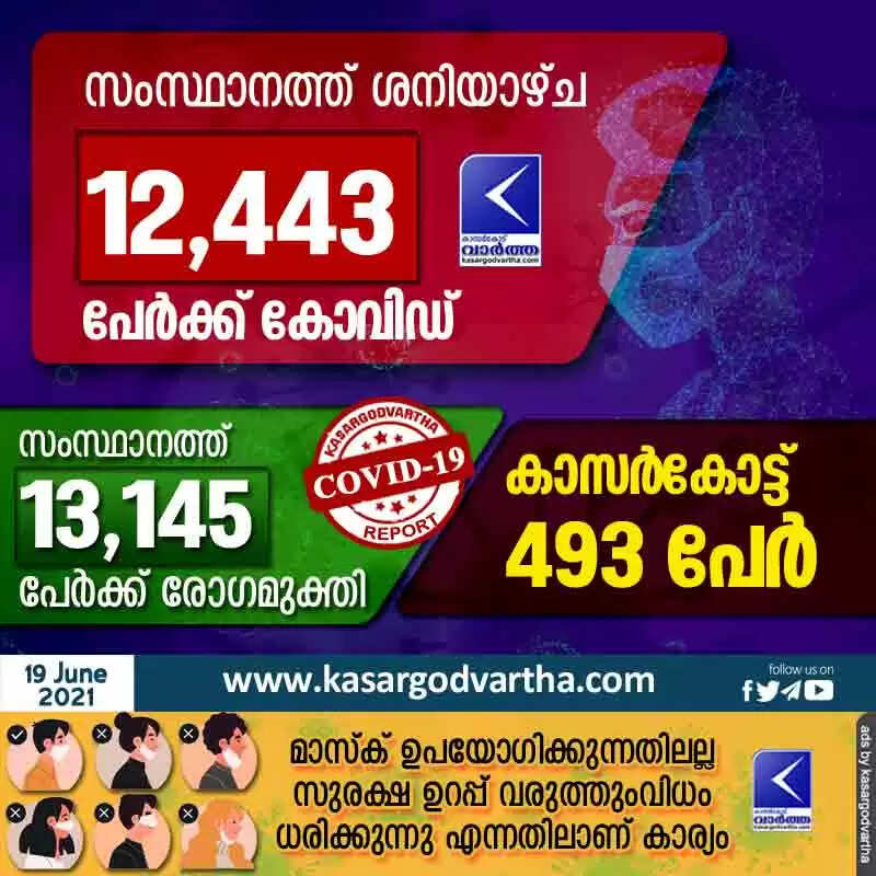 സംസ്ഥാനത്ത് ശനിയാഴ്ച 12,443 കോവിഡ് സ്ഥിരീകരിച്ചു: കാസർകോട് 493 പേർ