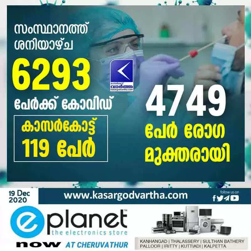 സംസ്ഥാനത്ത് ശനിയാഴ്ച 6293 പേര്‍ക്ക് കോവിഡ്; കാസര്‍കോട് 119 പേര്‍