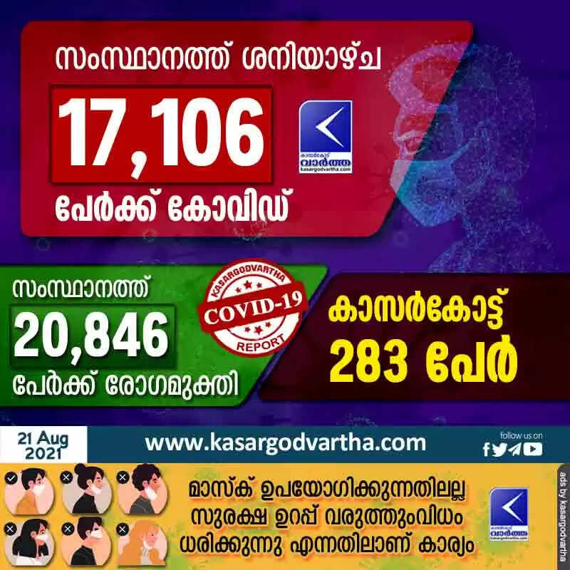 സംസ്ഥാനത്ത് ശനിയാഴ്ച 17,106 പേര്ക്ക് കോവിഡ് സ്ഥിരീകരിച്ചു: കാസർകോട് 283 പേർ