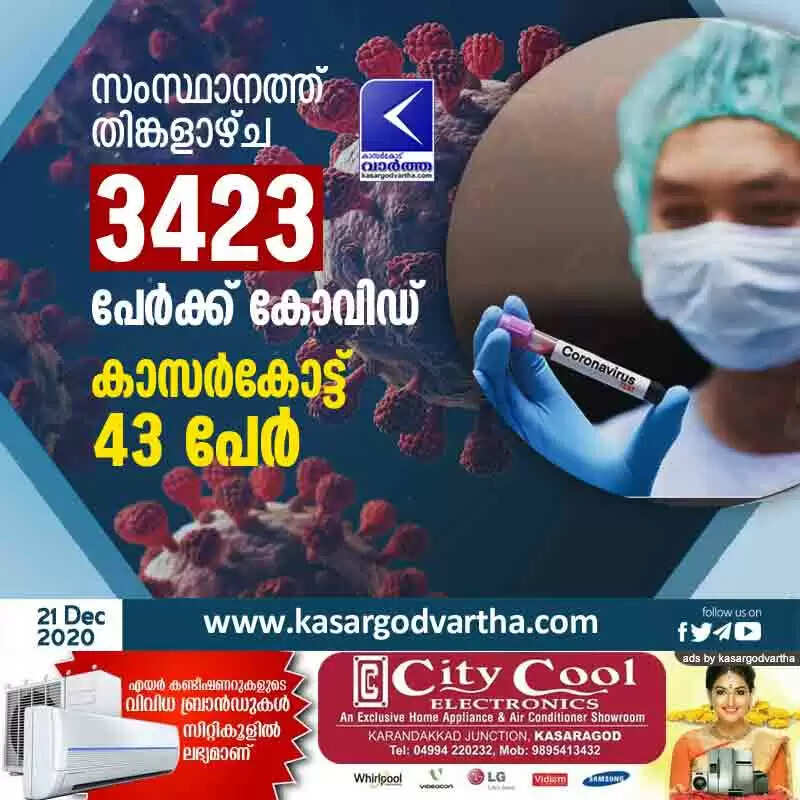 കാസര്‍കോട്: (www.kasargodvartha.com 21.12.2020) സംസ്ഥാനത്ത് തിങ്കളാഴ്ച 3423 പേര്‍ക്ക് കോവിഡ്-19 സ്ഥിരീകരിച്ചു.