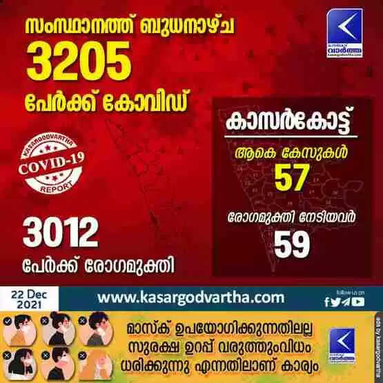 സംസ്ഥാനത്ത് ബുധനാഴ്ച 3205 പേര്ക്ക് കോവിഡ്: കാസർകോട് 57 പേര്