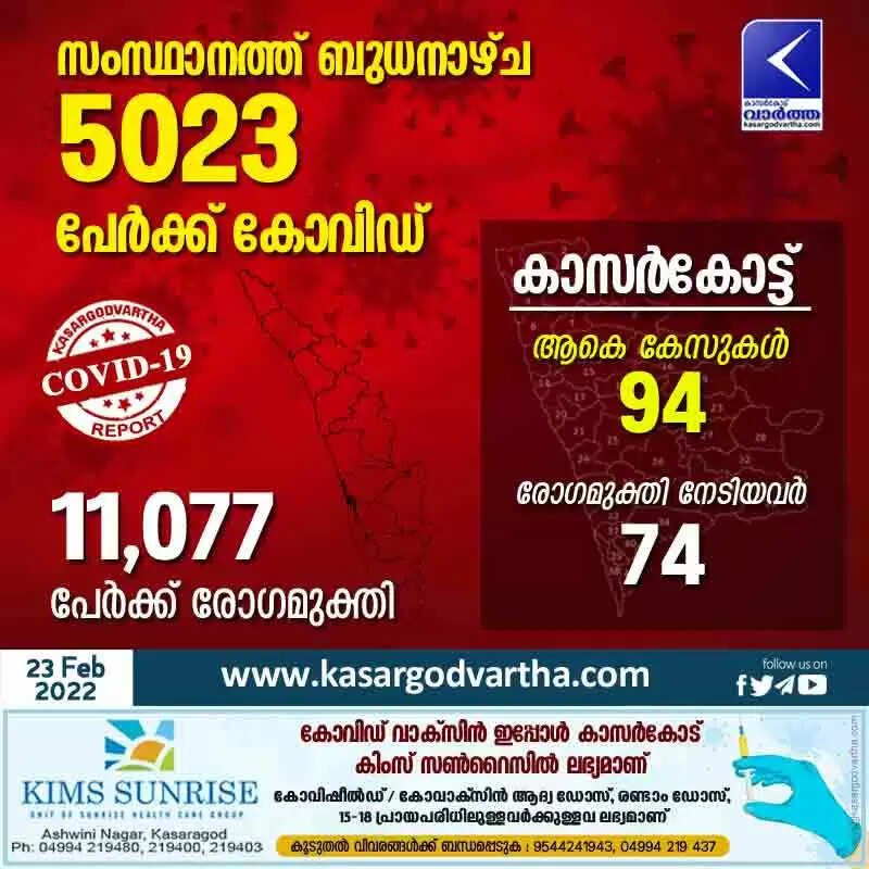 കേരളത്തില് ബുധനാഴ്ച 5023 പേര്ക്ക് കോവിഡ്: കാസർകോട് 94 പേര്