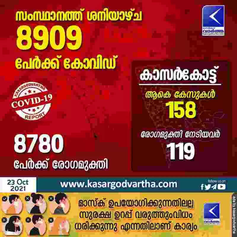 സംസ്ഥാനത്ത് ശനിയാഴ്ച 8909 പേർക്ക് കോവിഡ്; കാസർകോട് 158 പേർ