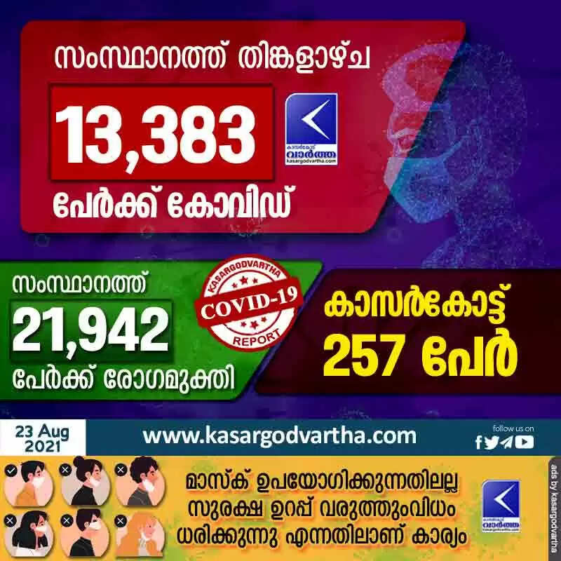 സംസ്ഥാനത്ത് തിങ്കളാഴ്ച 13,383 പേര്‍ക്ക് കോവിഡ് സ്ഥിരീകരിച്ചു: കാസർകോട് 257 പേർ