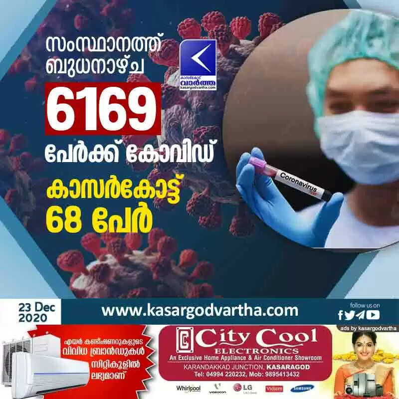 കാസര്‍കോട്: (www.kasargodvartha.com 23.12.2020) സംസ്ഥാനത്ത് ബുധനാഴ്ച 6169 പേര്‍ക്ക് കോവിഡ്-19 സ്ഥിരീകരിച്ചു.