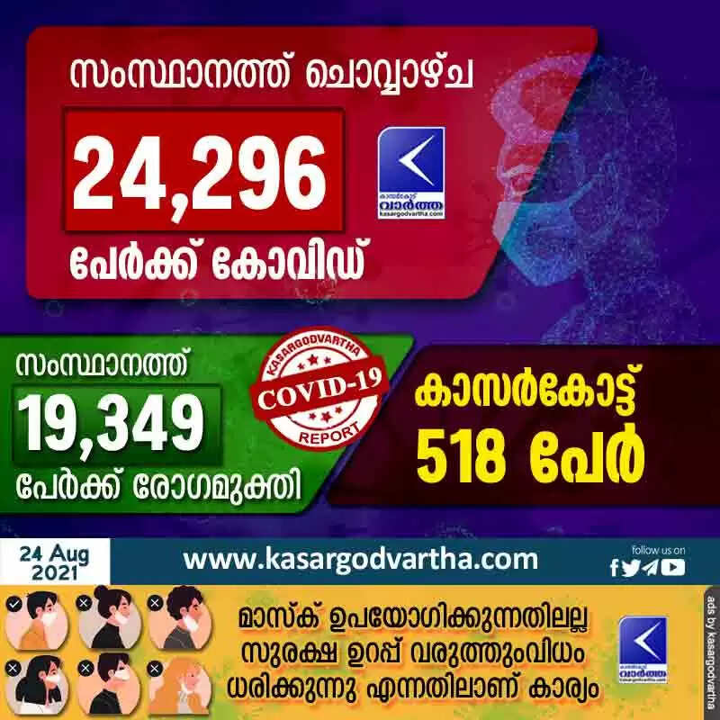 സംസ്ഥാനത്ത് ചൊവ്വാഴ്ച 24,296 പേര്ക്ക് കോവിഡ്-19 സ്ഥിരീകരിച്ചു.കാസർകോട് 518 പേർ